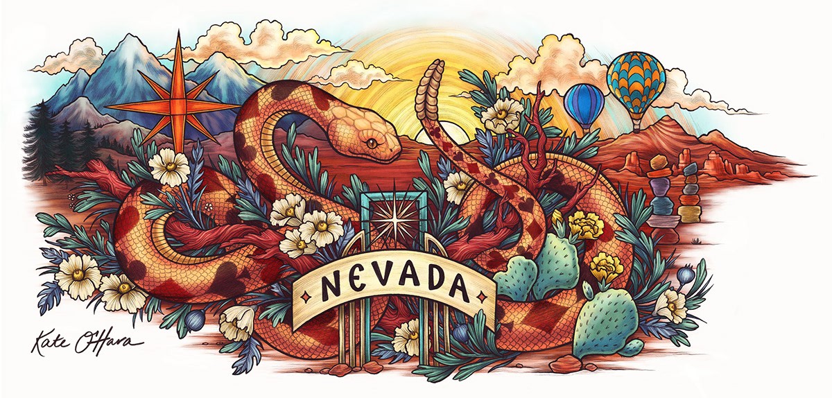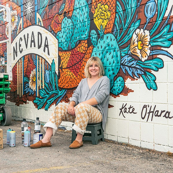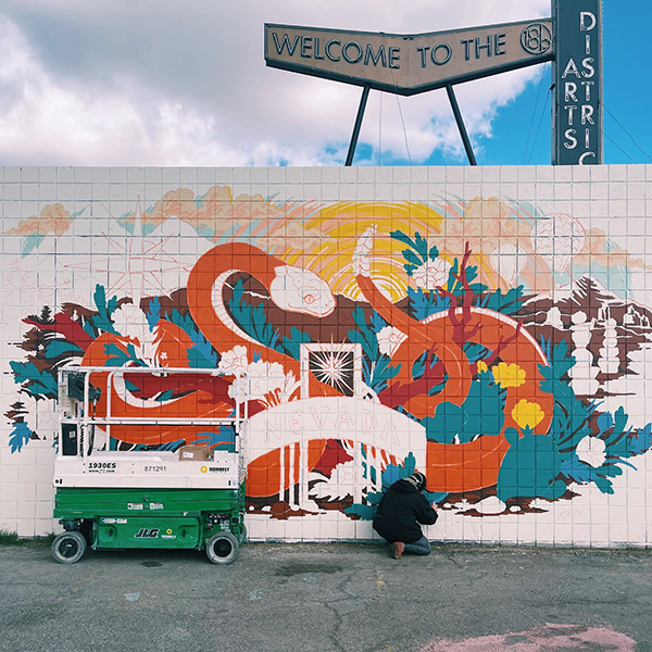 Kate O'Hara與 LIFEWTR 合作設(shè)計了一個代表她家鄉(xiāng)內(nèi)華達(dá)州及其對他有意義的水瓶。我們還根據(jù)瓶子的設(shè)計組合了一套不同的商品,包括頭巾、別針、貼片、貼紙和帽子。然后,他們聘請我根據(jù)瓶子設(shè)計繪制兩幅壁畫,一幅在里諾大學(xué),另一幅在拉斯維加斯藝術(shù)區(qū)。