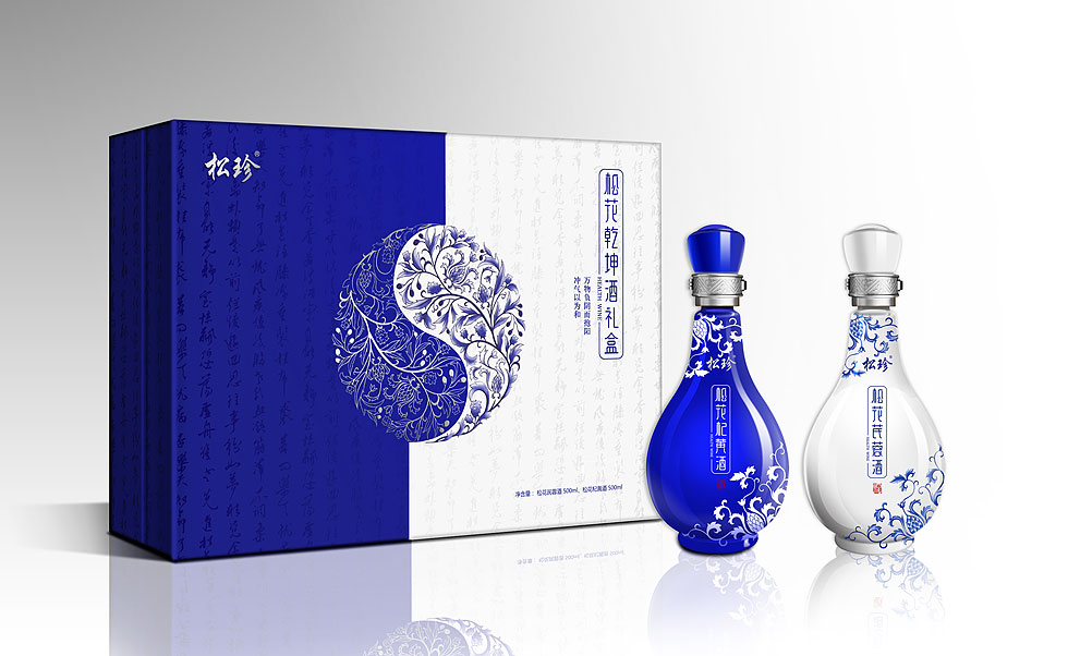 項目背景:“善補陽者,必于陰中求陽,則陽得陰助而生化無窮;善補陰者,必于陽中求陰,則陰得陽生而泉源不竭?!彼苫ㄜ稳鼐?、松花杞黃酒包裝設計以太極為基礎概念,考慮融合太極、乾坤理念,單品可以銷售,兩瓶酒相聚亦可形成乾坤禮盒。
