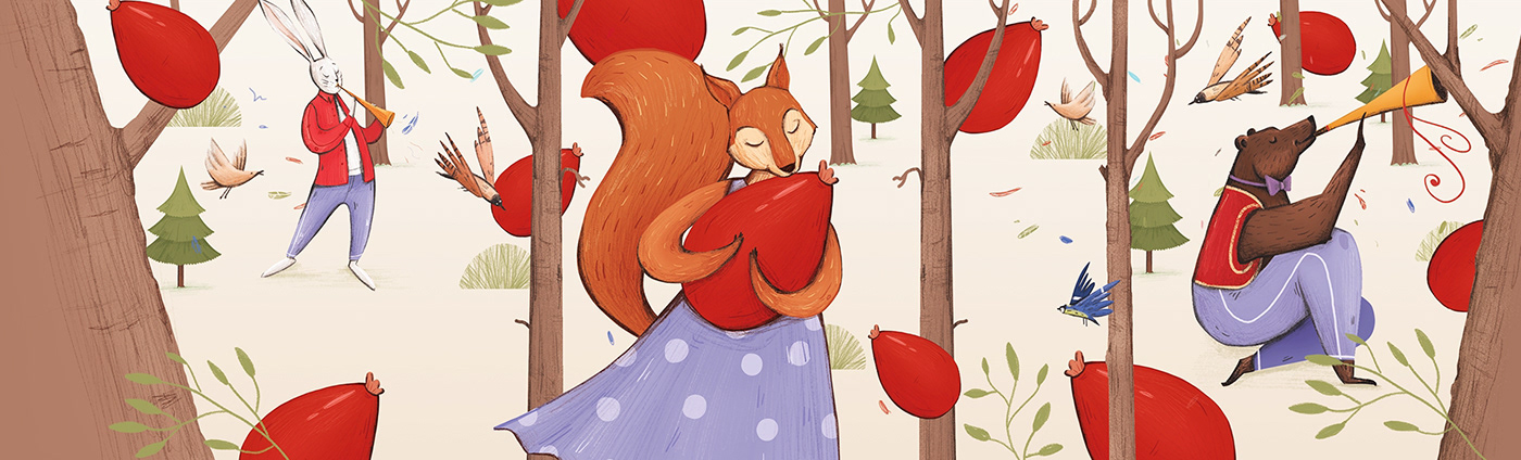 在這個(gè)設(shè)計(jì)項(xiàng)目中,我想到了要描繪一個(gè)神奇的森林。那里的動(dòng)物就像人一樣,穿著人類的衣服衣服。散步穿過她的莊園森林里有漿果,熊在吹笛。