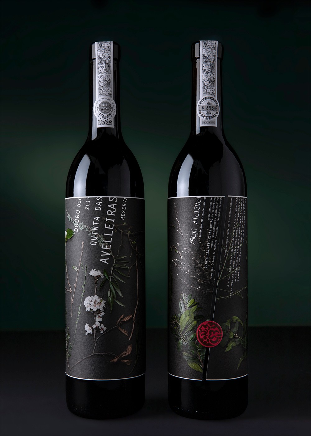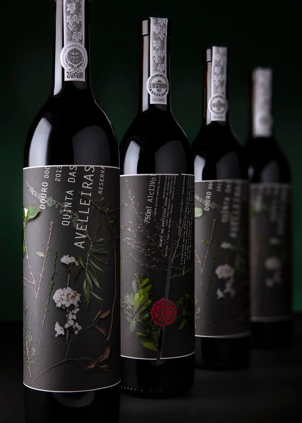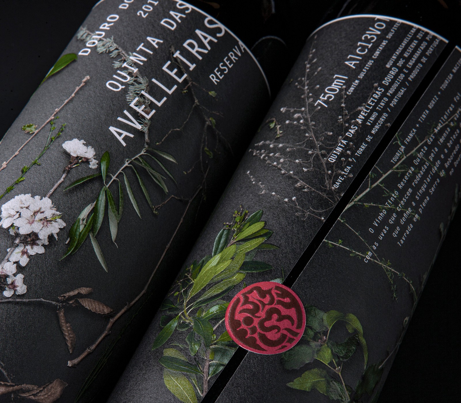 與標(biāo)簽的傾斜切口的角度平行設(shè)置的傾斜文本從上帶向下流到下帶,從而創(chuàng)建了一個(gè)框架,使圖形元素可以呼吸。圖紙的嚴(yán)格程度,膠版印刷(CMYK),面漆的應(yīng)用-保留的啞光清漆和高浮雕-以及紙張的選擇(Arconvert Cotone Bianco)都產(chǎn)生了標(biāo)簽,可以通過增加價(jià)值來提高產(chǎn)品質(zhì)量到Quinta das Avelleiras Reserva Douro包裝。
