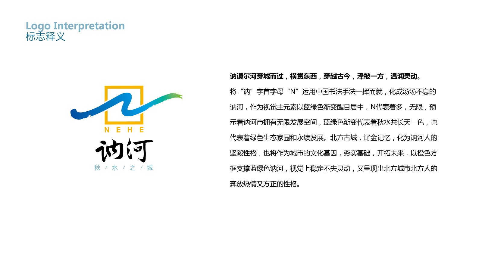 訥河城市品牌形象設(shè)計創(chuàng)意釋義:訥謨爾河穿越而過,橫貫東西,穿越古今,澤被一方,溫潤靈動。我們將“訥”字首字母[N]運用中國書法手法一揮而就,化成湯湯不息的訥河,作為視覺主元素以藍綠色漸變醒目居中,N代表著多,無限,預(yù)示著訥河擁有無限發(fā)展空間,藍綠色漸變代表著秋水共長天一色,也代表著綠色生態(tài)家園和永續(xù)發(fā)展。北方古城,遼金記憶,化為訥河人的堅毅性格,也將作為城市的文化基因,夯實基礎(chǔ),開拓未來,以橙色方框支撐藍綠色訥河,視覺上穩(wěn)定不失靈動,又呈現(xiàn)出北方城市北方人的奔放熱情又方正的性格。