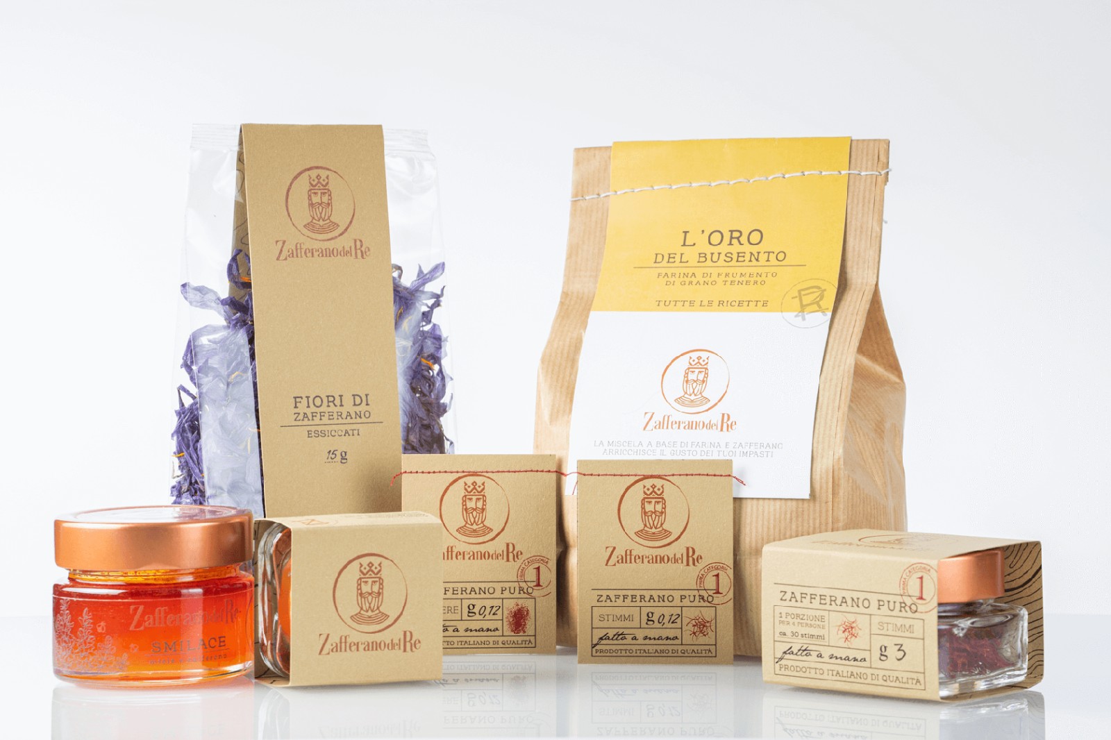 像國王寶藏中的黃金那樣的貴重產(chǎn)品,以純藏紅花的形式分布在柱頭和粉末中,像食用花卉一樣干燥,加到蜂蜜中成為原始的Smielace,與面粉混合后變成L'oro del Busento。每個包裝都是用手封閉的,即使是單劑量包裝的密封圈也帶有紅色螺紋接縫。每包中都包含一張藏寶圖,以強調(diào)藏紅花的概念:藏寶。