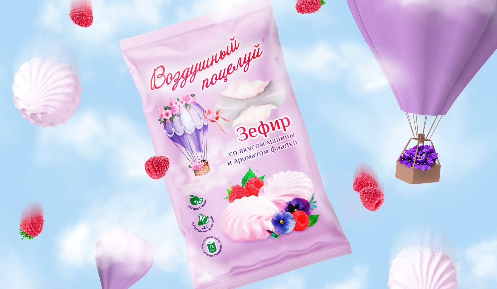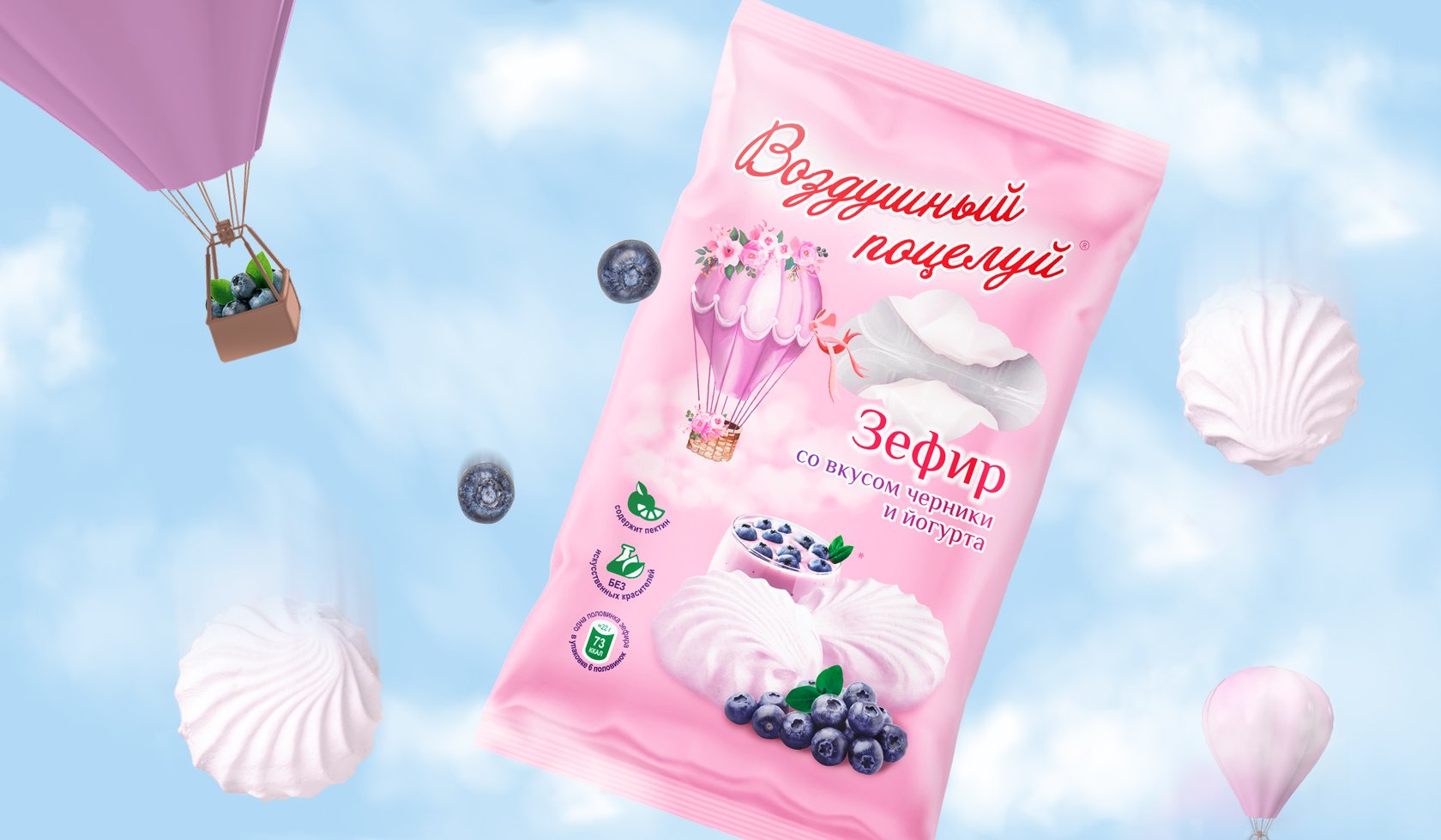 三種口味的棉花糖系列 Air Kiss 的包裝設(shè)計(jì):Sormovskaya Confectionary Factory 品牌的覆盆子紫羅蘭、檸檬甜點(diǎn)、藍(lán)莓酸奶。